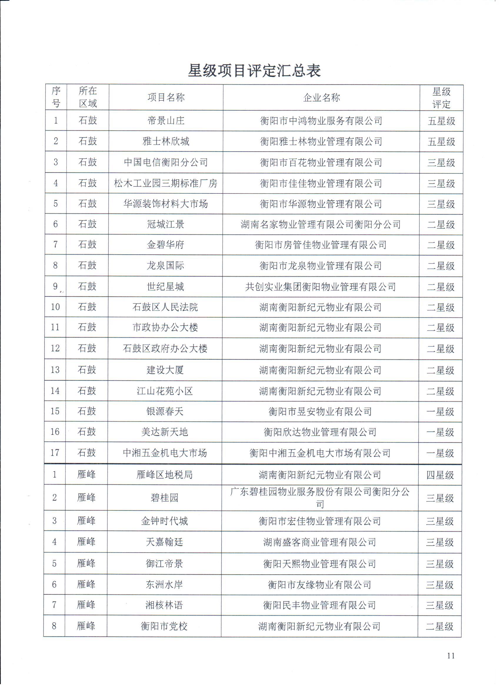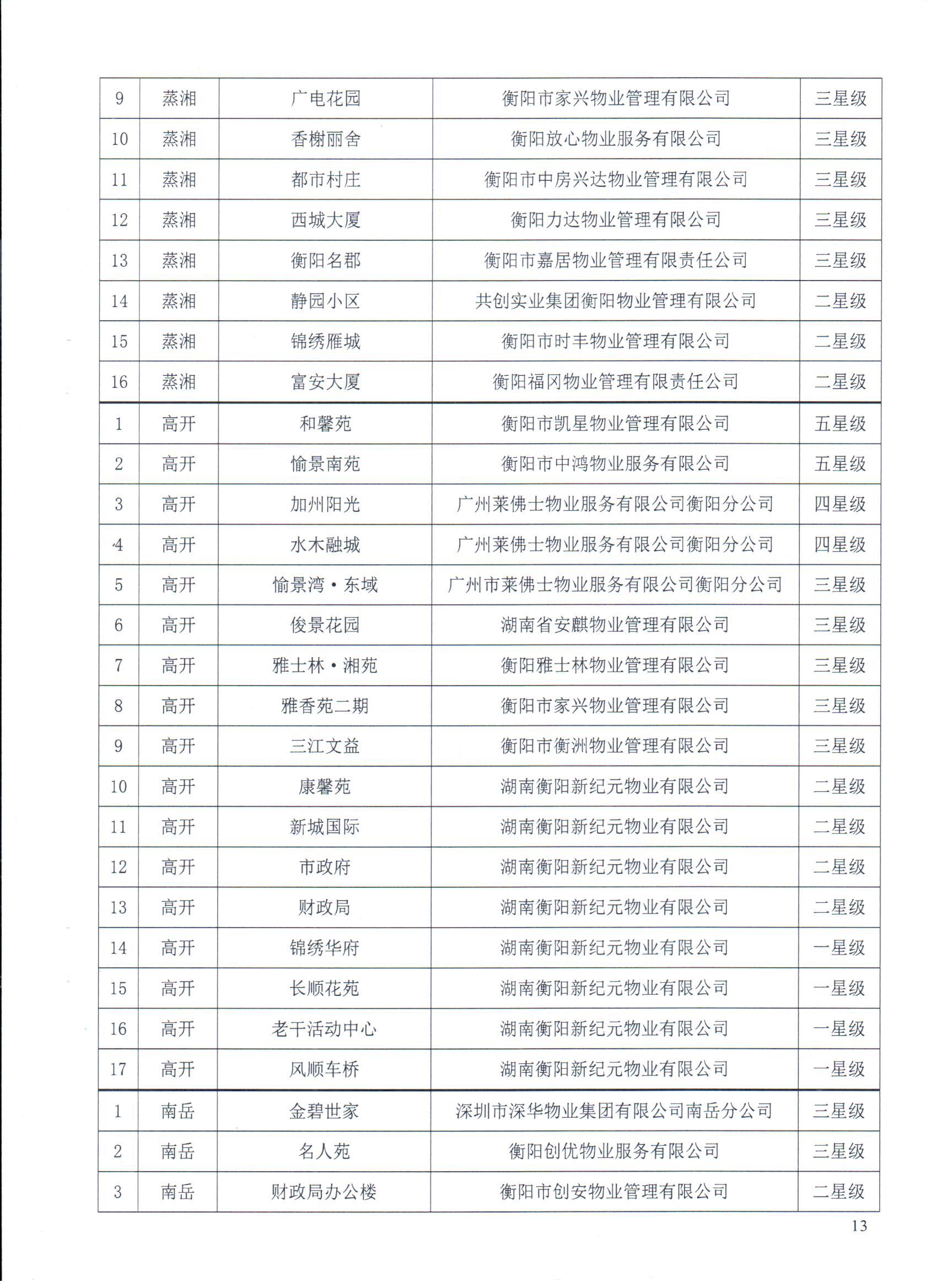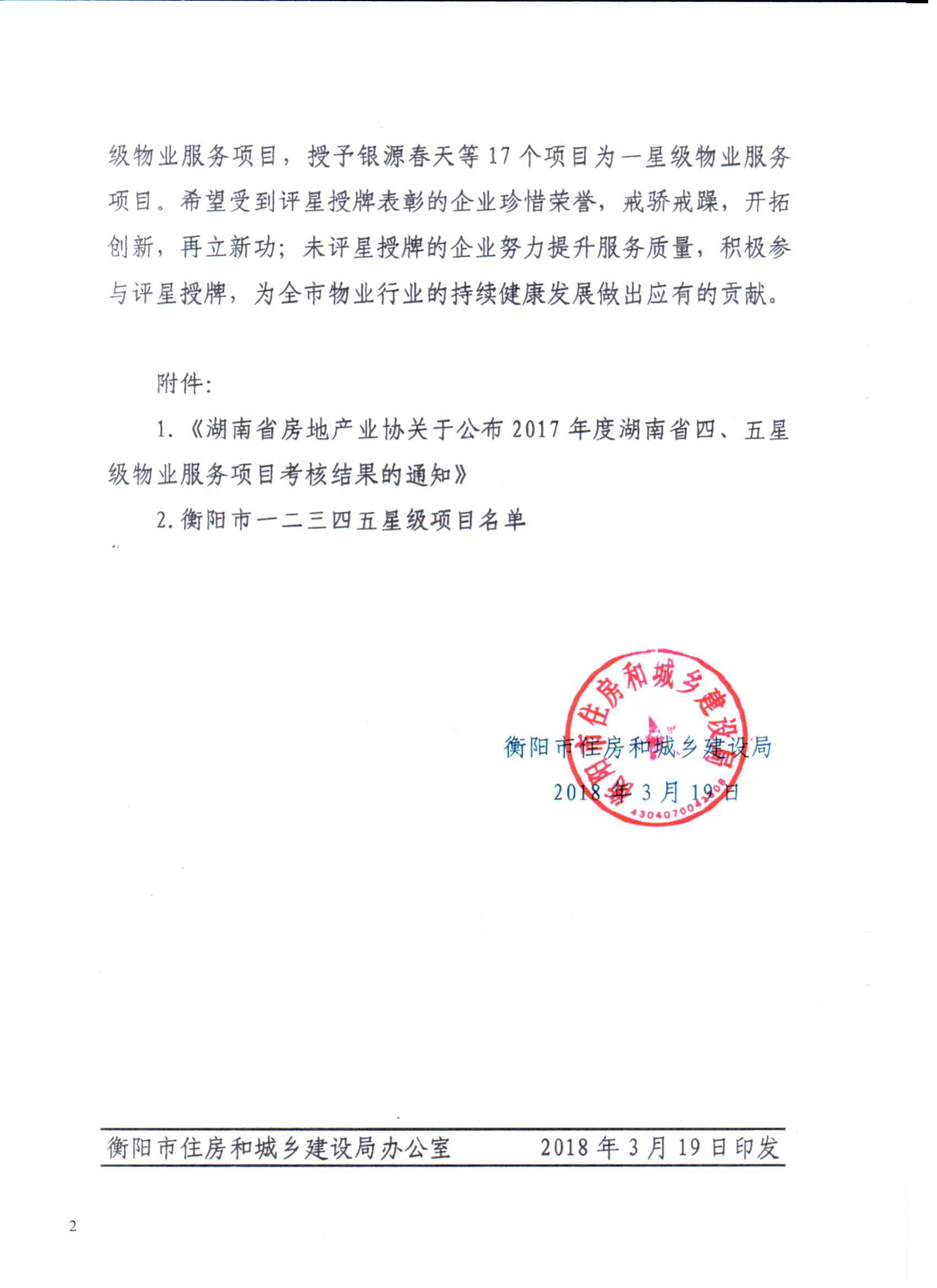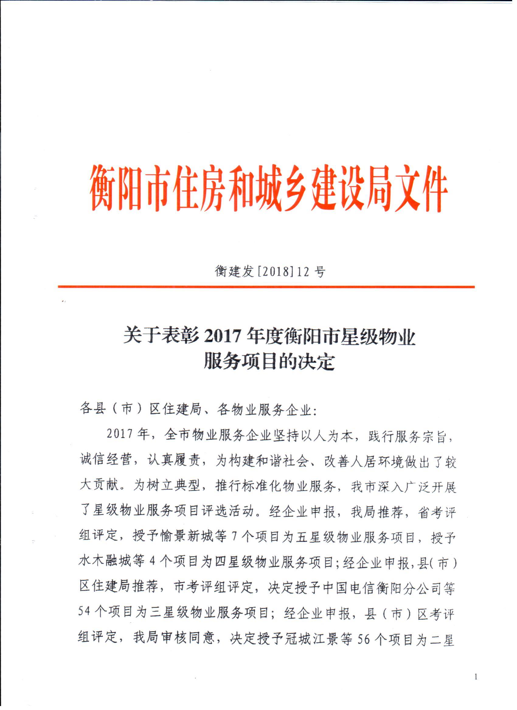 关于表彰2017年度衡阳市星级物业服务项目的决定