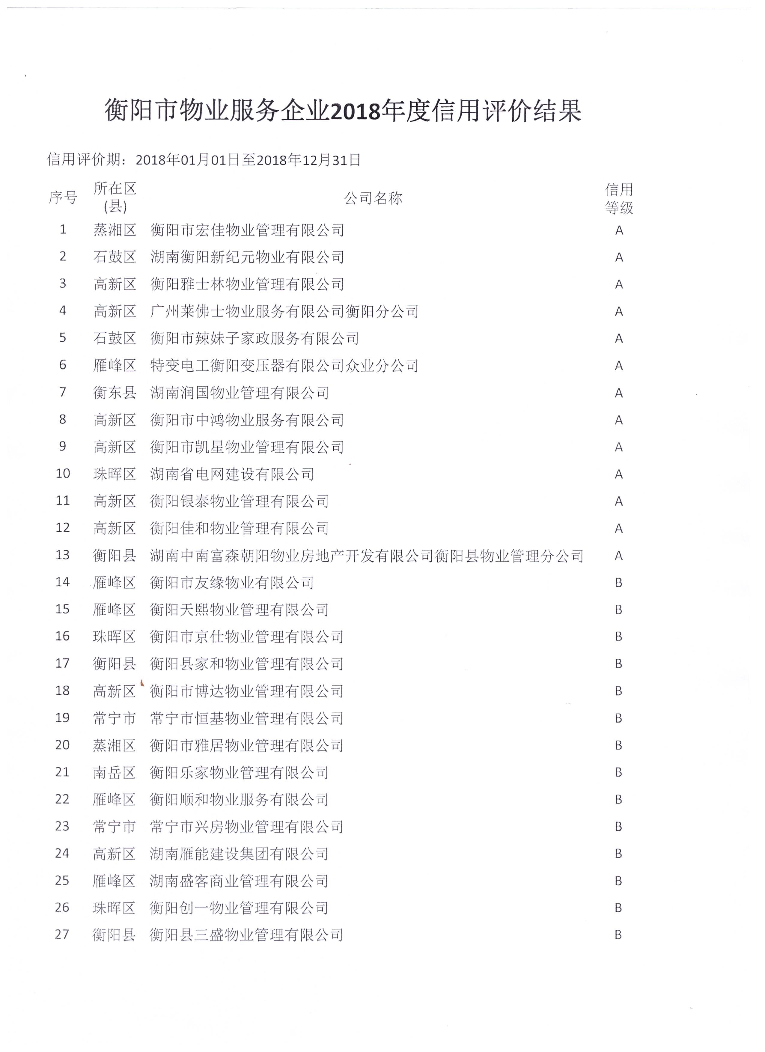 关于衡阳市2018年度物业服务企业信用评价结果的公示(第一批)