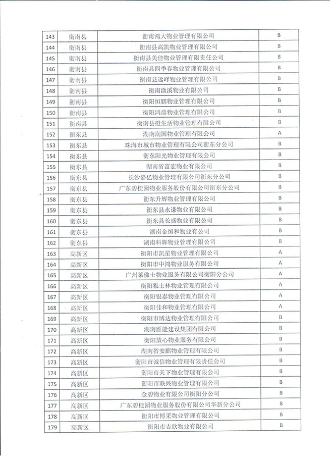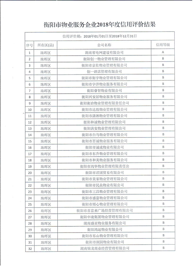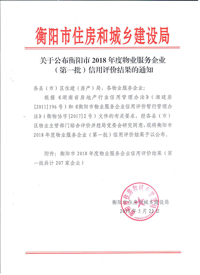 关于公布衡阳市2018年度物业服务企业(第一批)信用评价结果的通知