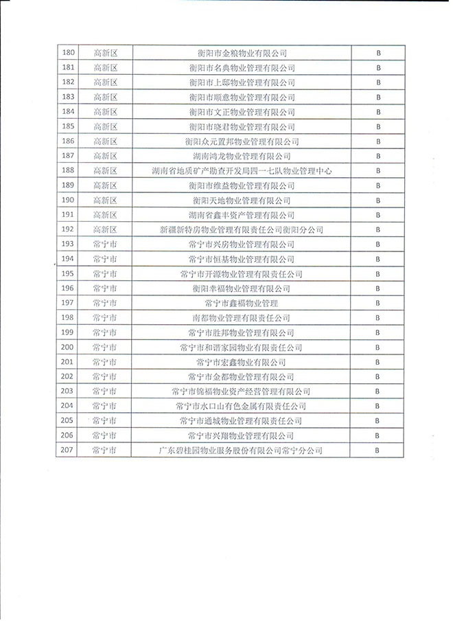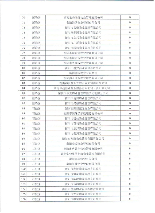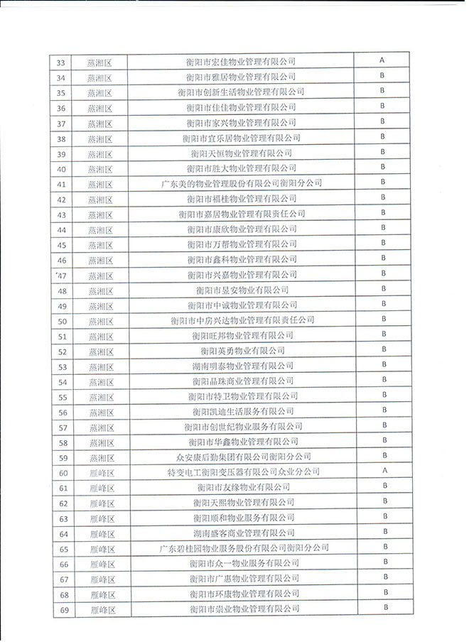 关于衡阳市2018年度物业服务企业(第二批)信用评价结果的公示