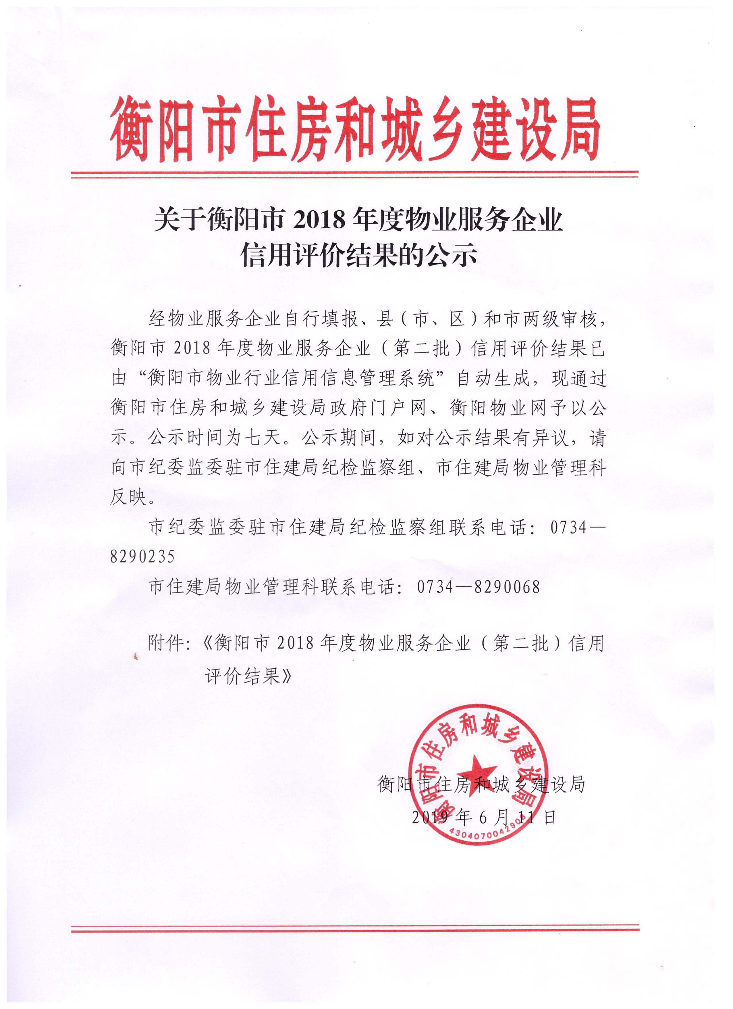 关于公布衡阳市2018年度物业服务企业(第一批)信用评价结果的通知