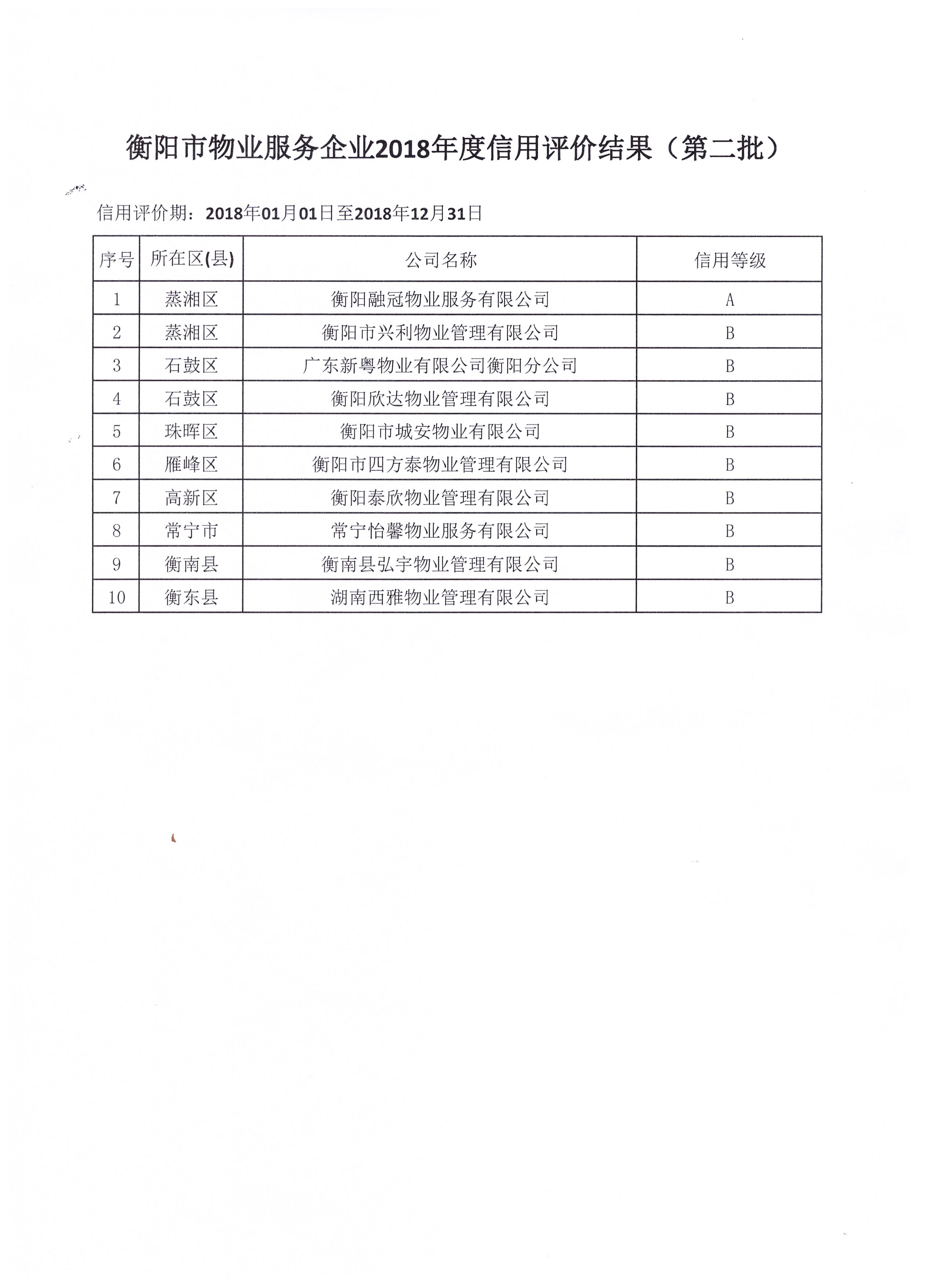 关于衡阳市2018年度物业服务企业(第二批)信用评价结果的公示