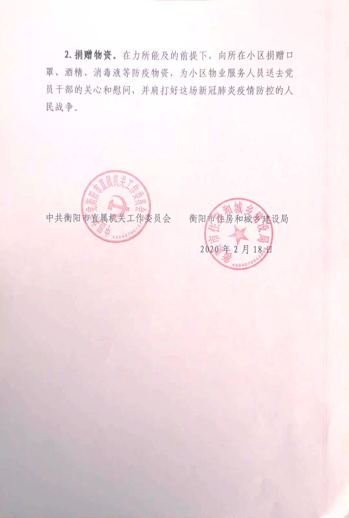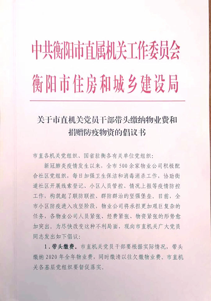 关于市直机关党员干部带头缴纳物业费和损赠防疫物资的倡议书