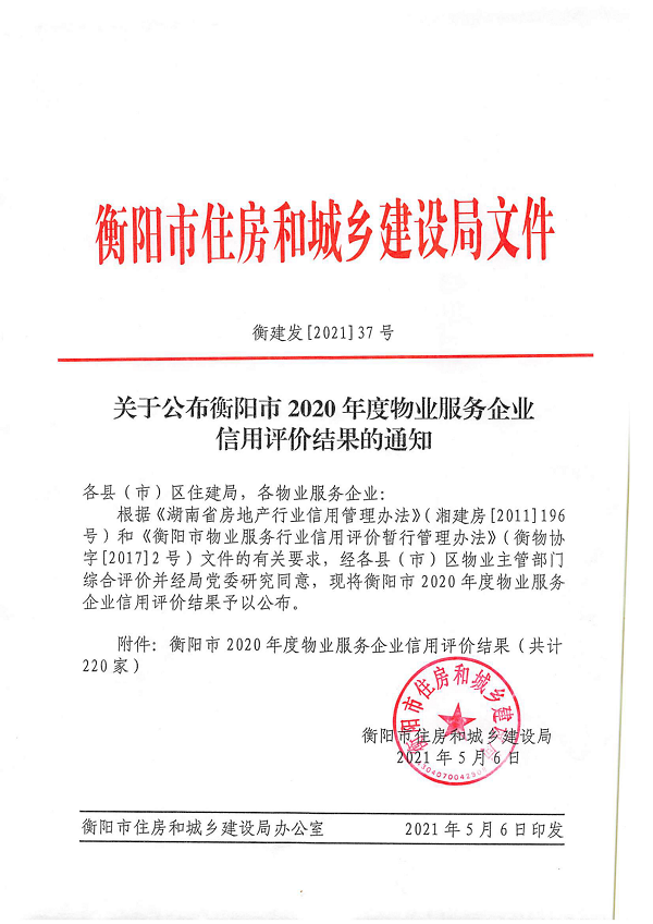 关于公布衡阳市2020年度物业服务企业信用评价结果的通知