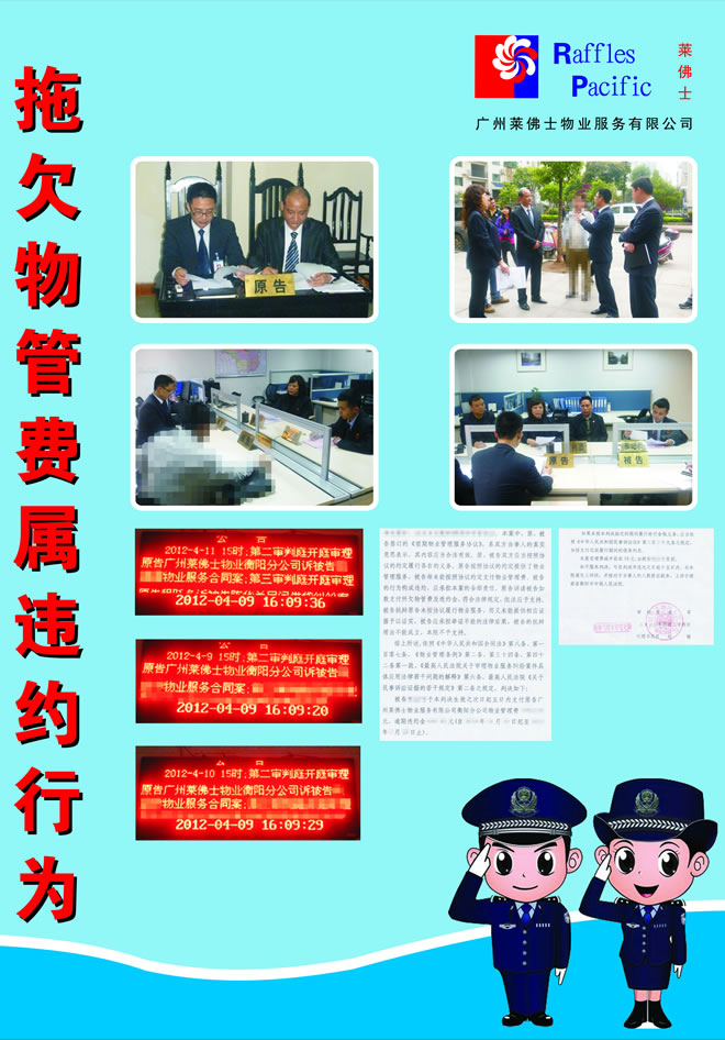 拖欠物管费,后果是什么?后果之一就是物业企业把业主告上法庭。近日,广州莱佛士物业服务有限公司起诉一户欠费业主,法院判决被告的行为构成违约,应如数支付所欠物管费及违约金。