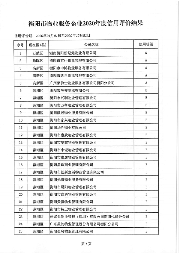 关于公布衡阳市2020年度物业服务企业信用评价结果的通知
