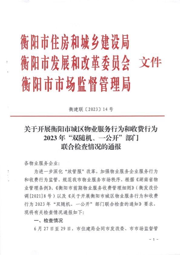 《关于开展衡阳市城区物业服务行为和收费行为2023年“双随机、一公开”部门联合检查情况的通报》